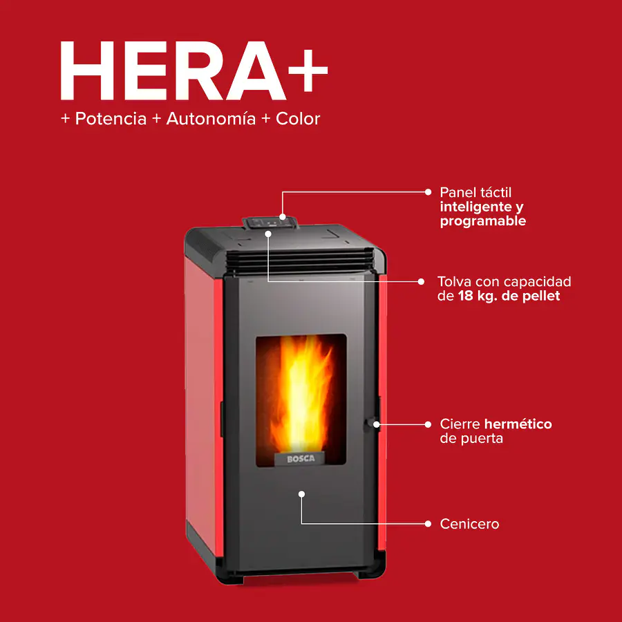 La Estufa a Pellet Bosca Hera Roja es la solución definitiva para quienes buscan una calefacción potente, económica y sustentable. Diseñada para cubrir superficies de hasta 160 m2, este modelo utiliza pellet, una fuente de energía renovable fabricada con residuos fósiles que destaca por su alta eficiencia. Con un acabado en color Rojo/Inox y construida con 70 kg de acero de alta resistencia, combina durabilidad con un diseño moderno.